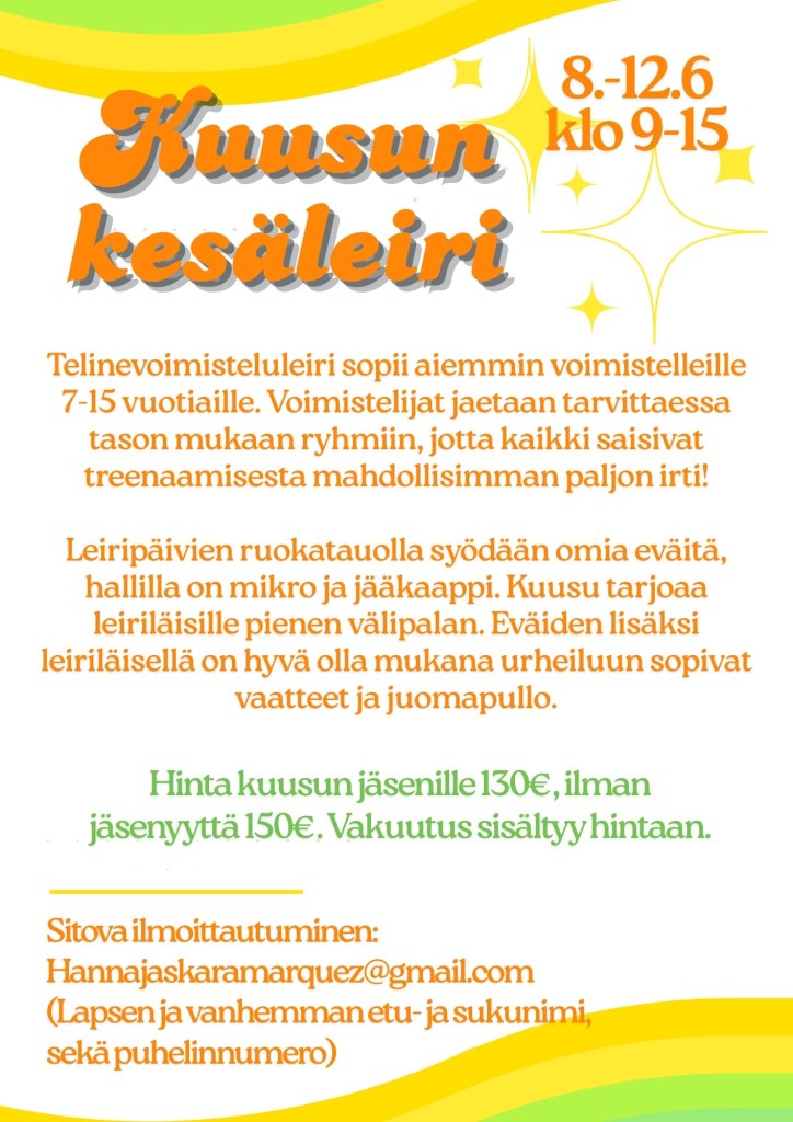 KuusUn kesäleiri 24-28.07.2023 Lisätietoja ja ilmoittautumisohjeet löytyvät ylempää mainoksesta.